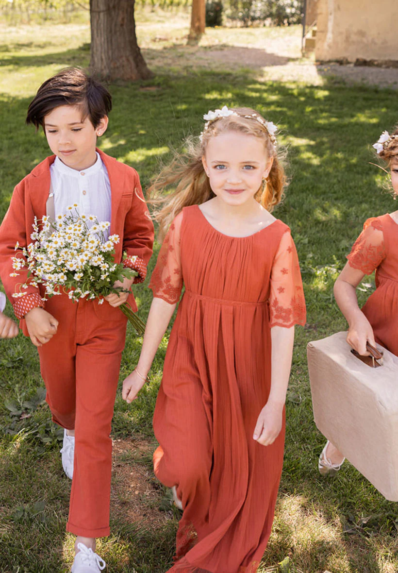 Disponible pour nos robes de cérémonie, du 6 Mois au 14 ans, la robe de cortège bohème terracotta Thelma conviendra parfaitement pour les cérémonies estivales.