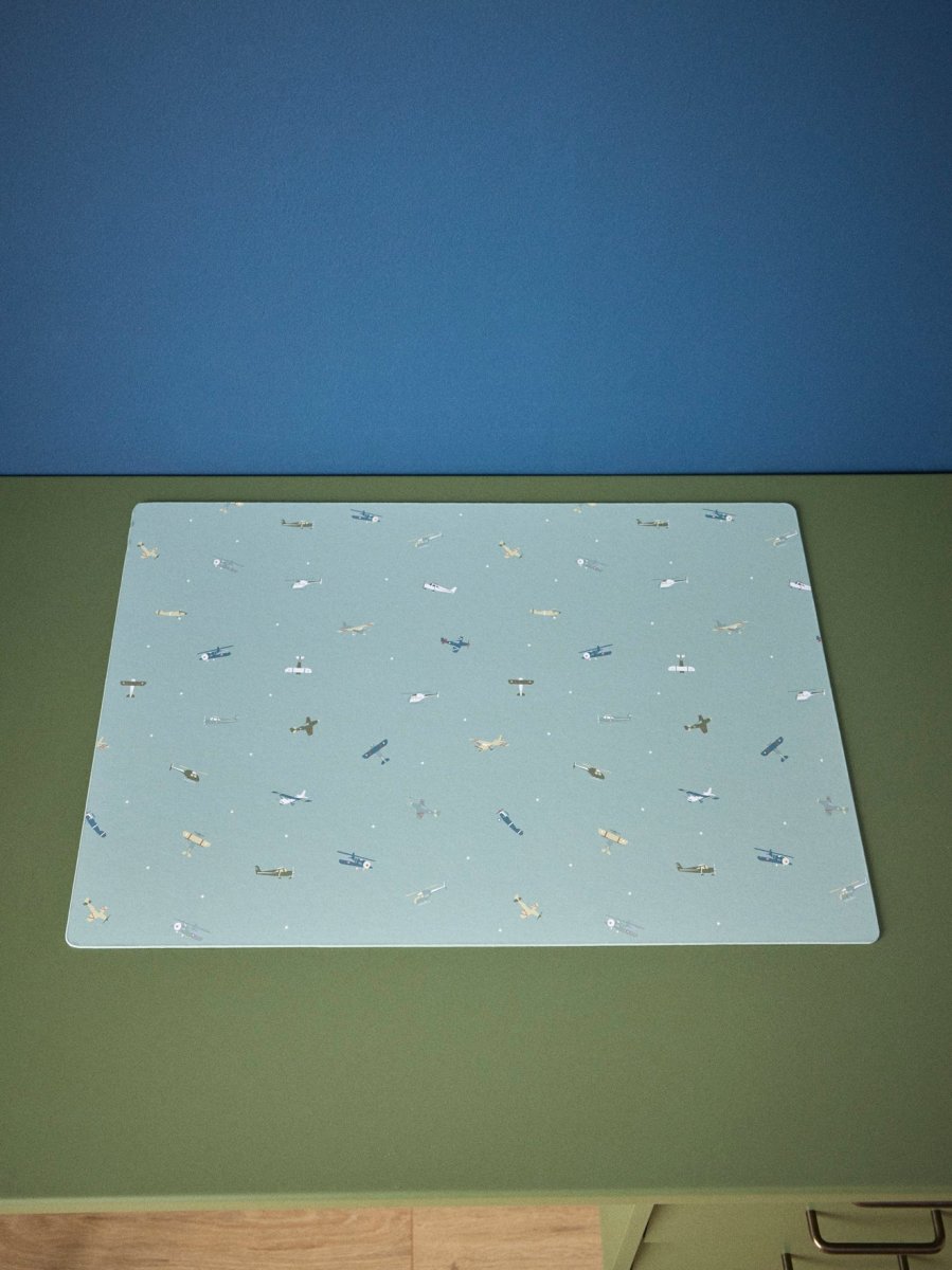 Sous-main en papier carton légèrement structuré. Impression recto/verso et contour huilé. Objet unique, pratique et décoratif ; idéal pour protéger une table ou bureau.
