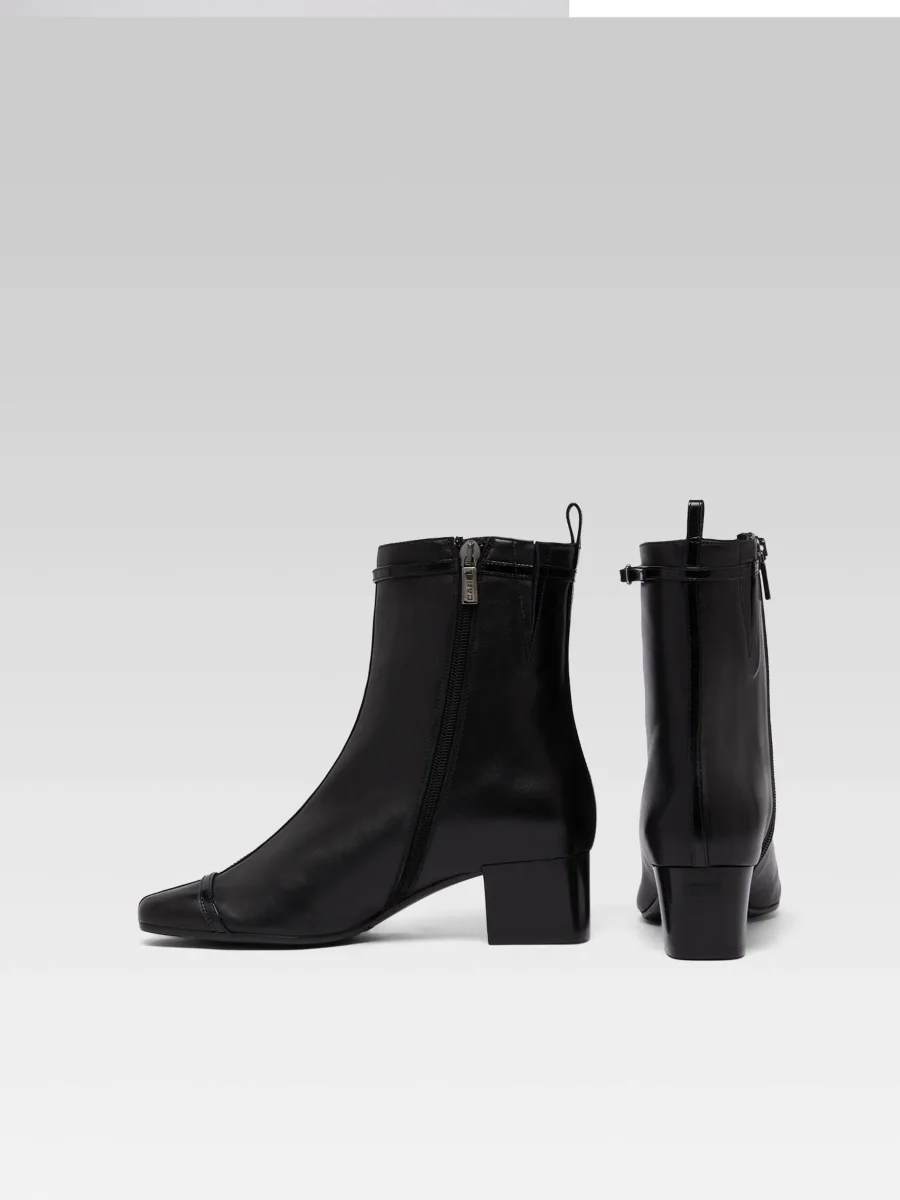 Les bottines Start arborent la signature de Carel : des brides décoratives à boucle, autour de la cheville et à l’avant, créant l’illusion d’un bout droit.