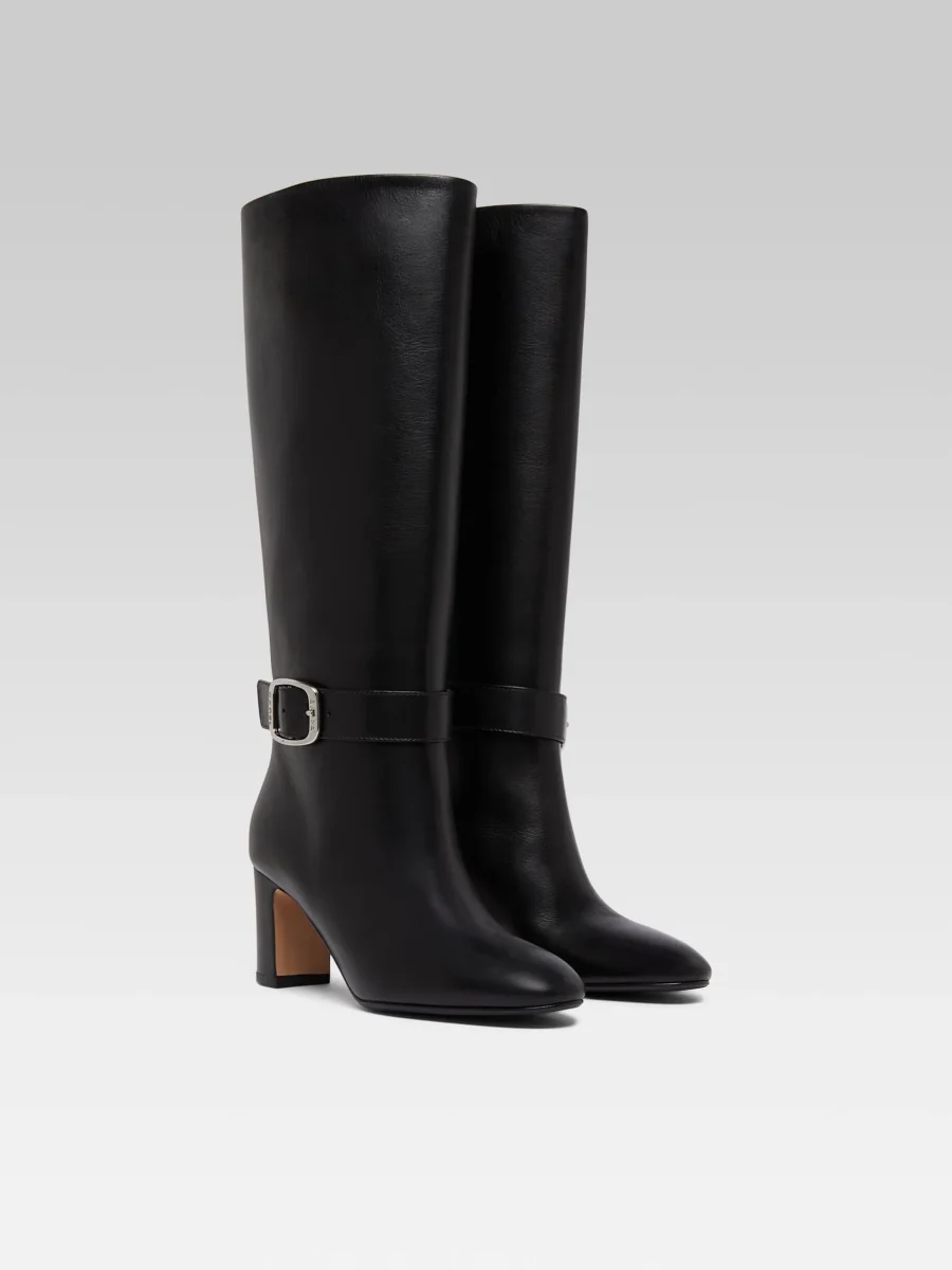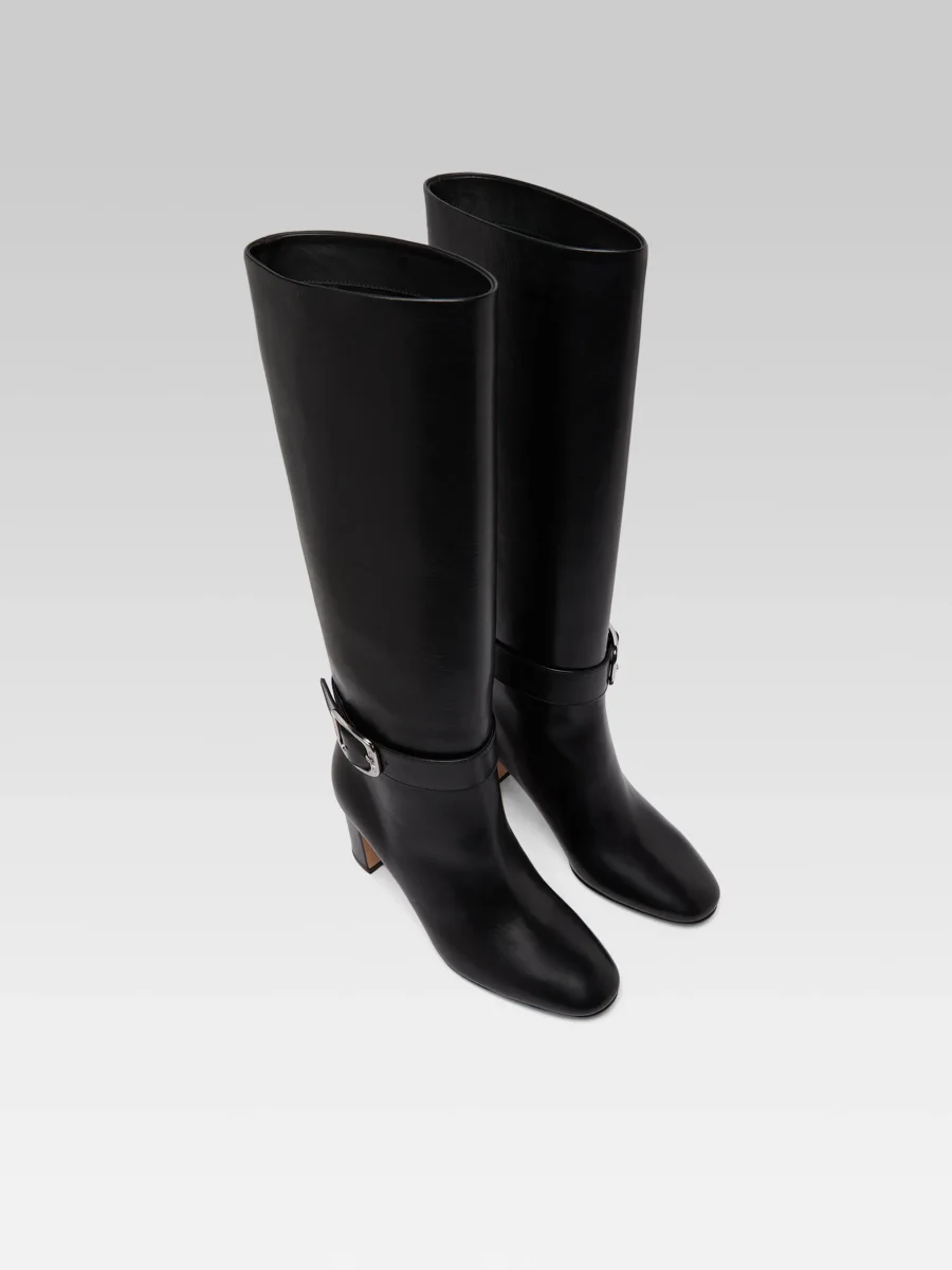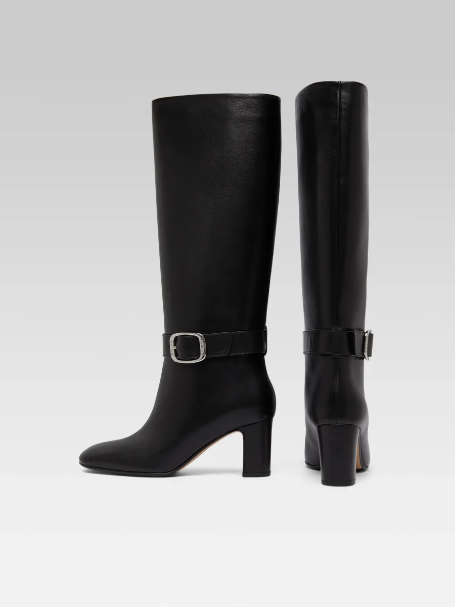 La botte Thalia, intemporelle et élégante avec son talon à gorge, est ornée d’une large bride dotée d’une boucle Carel XXL.