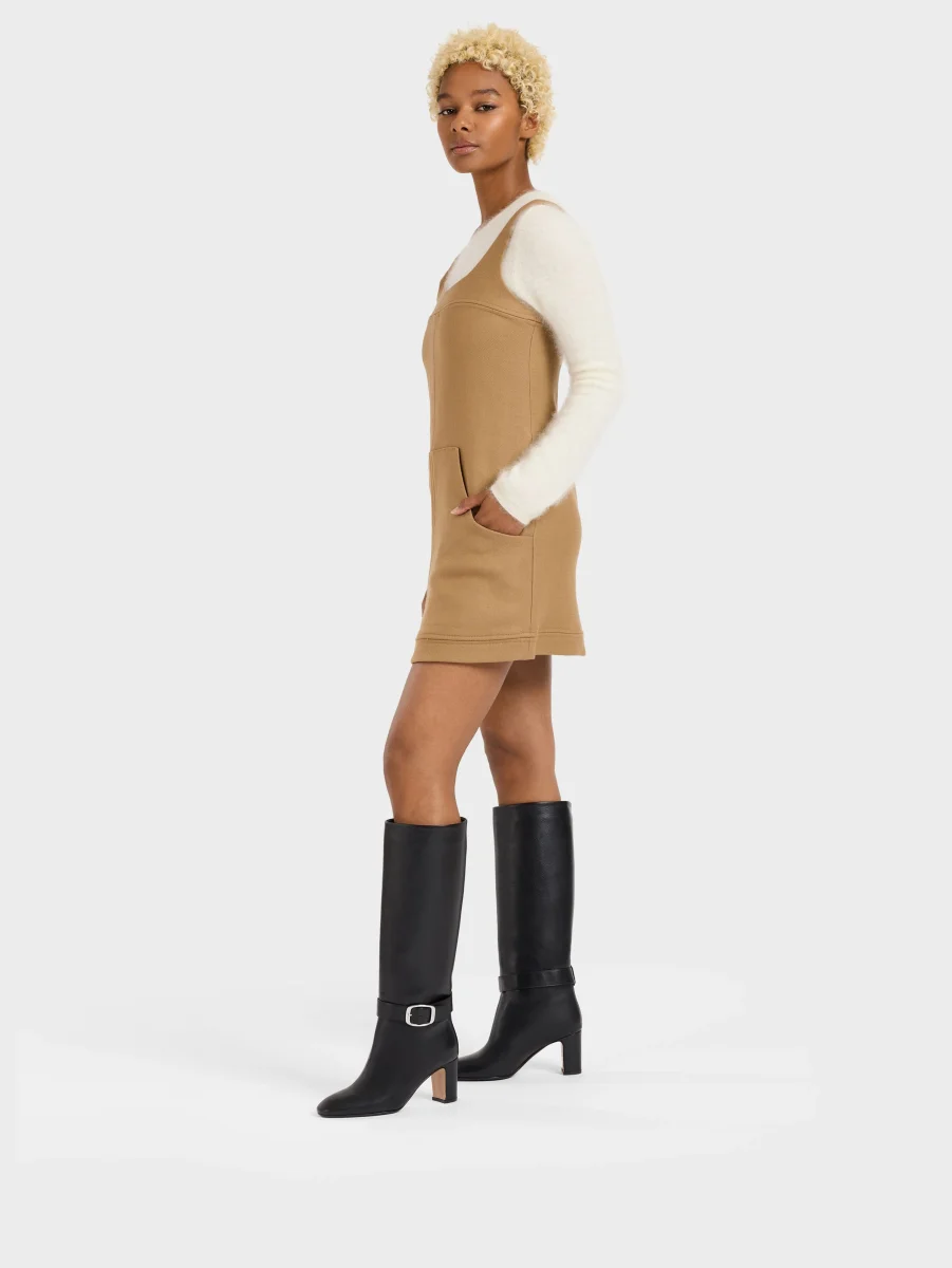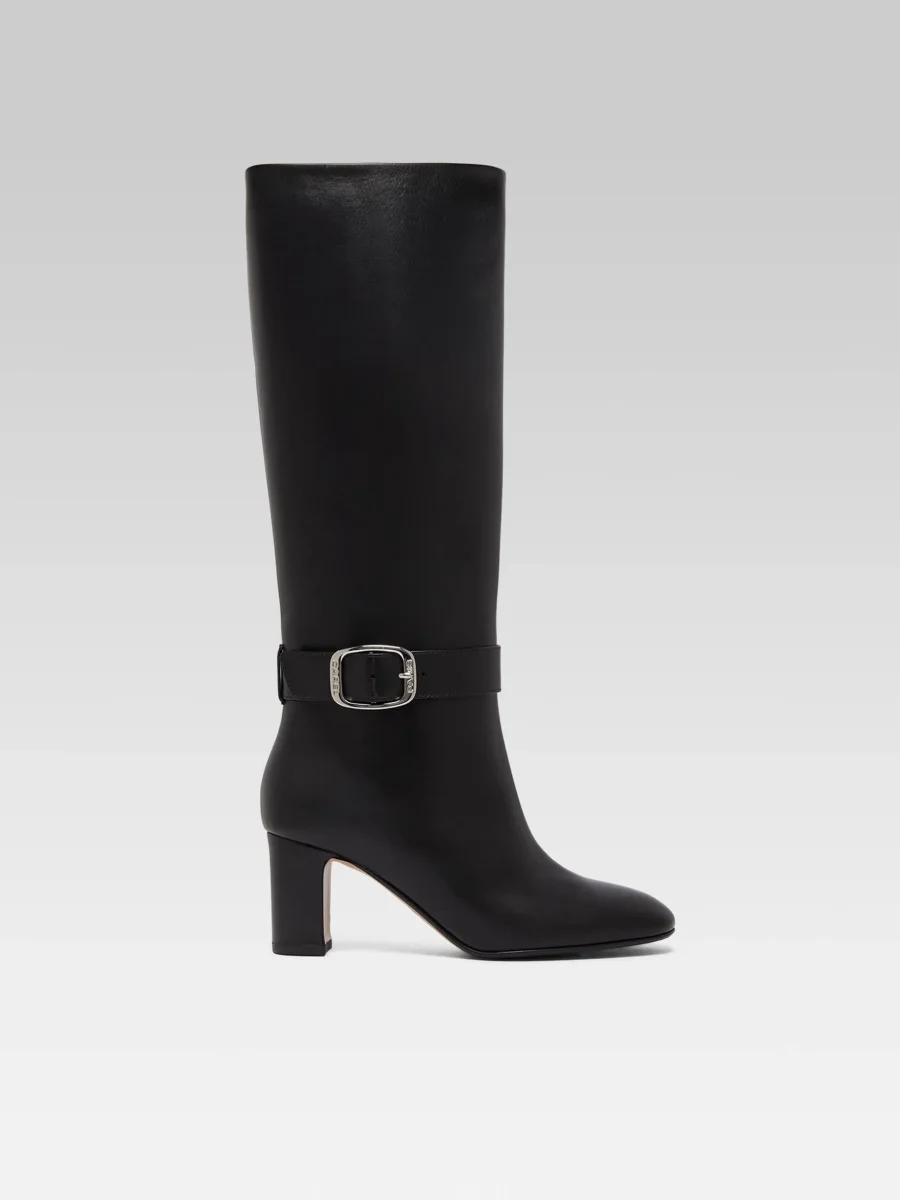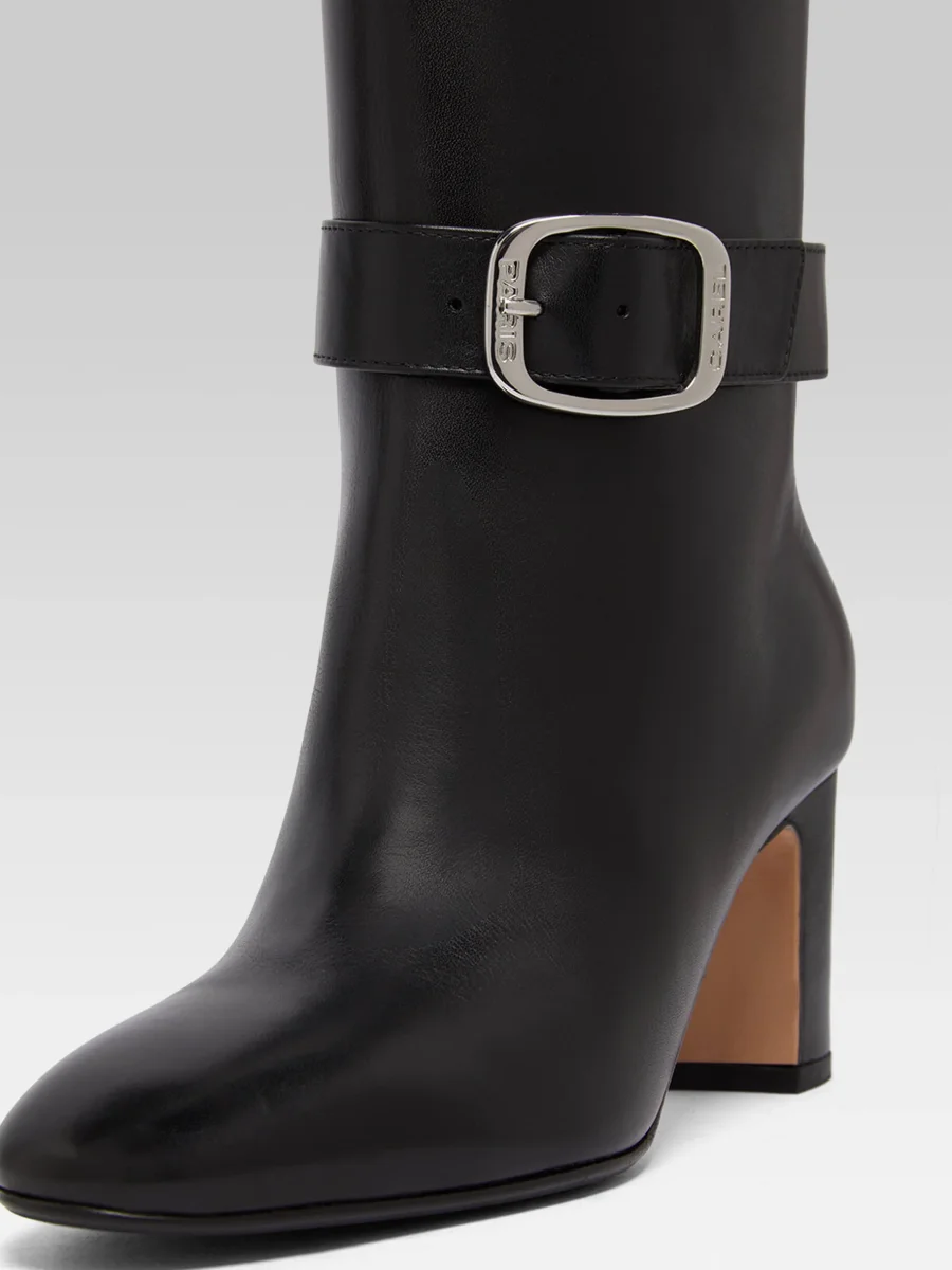 La botte Thalia, intemporelle et élégante avec son talon à gorge, est ornée d’une large bride dotée d’une boucle Carel XXL.