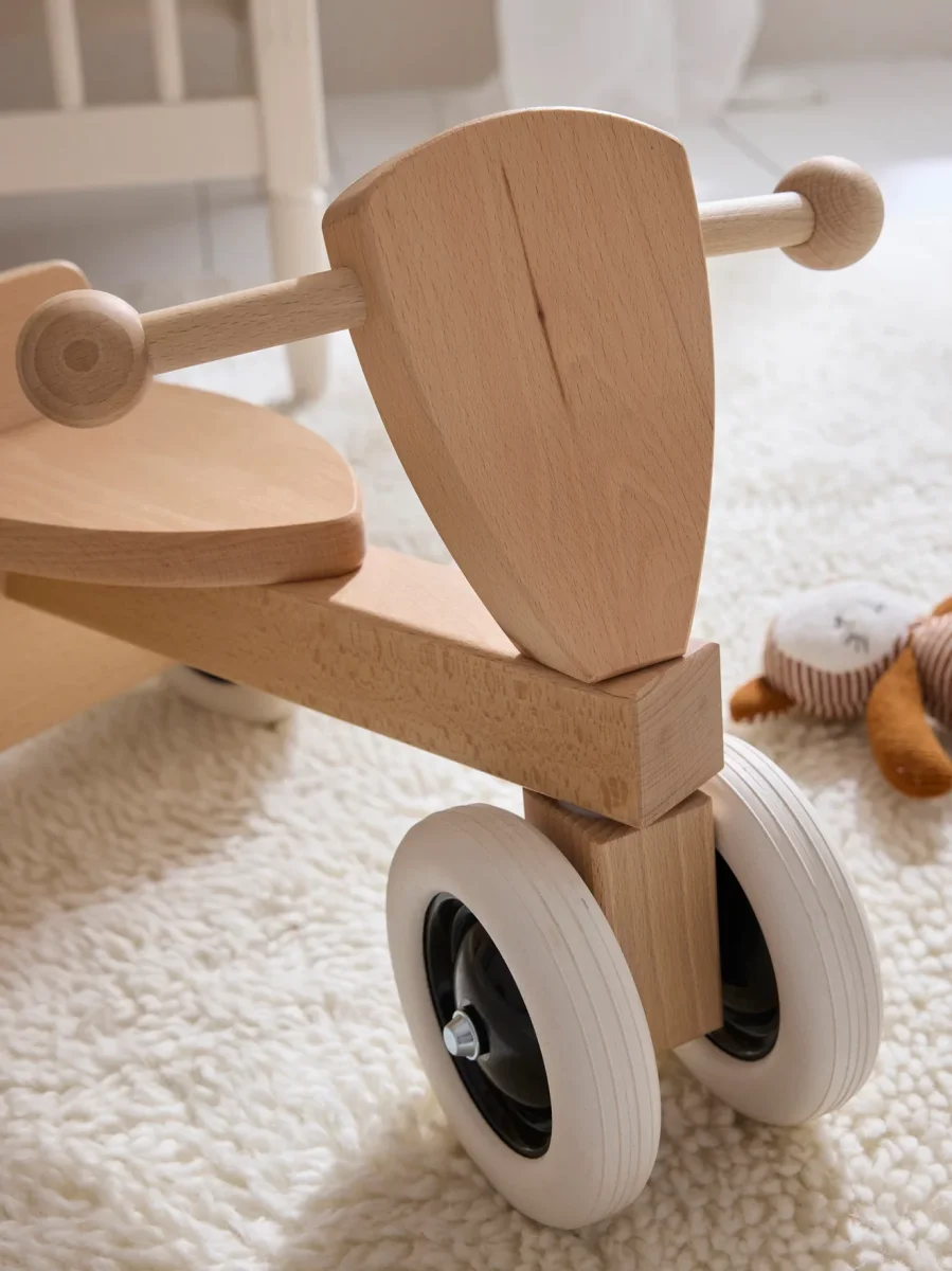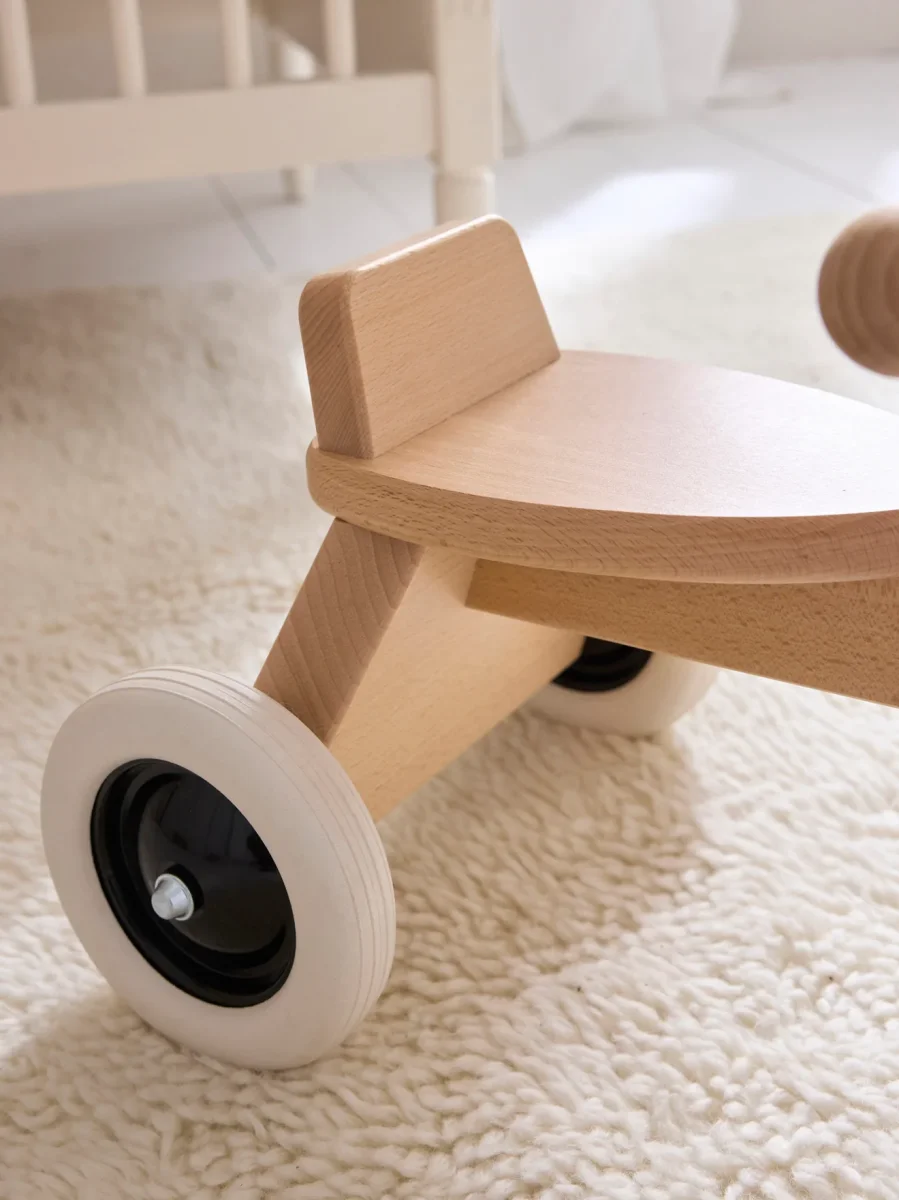 Petit tricycle en bois naturel fabriqué en Allemagne. Larges roues en caoutchouc pour une parfaite stabilité.