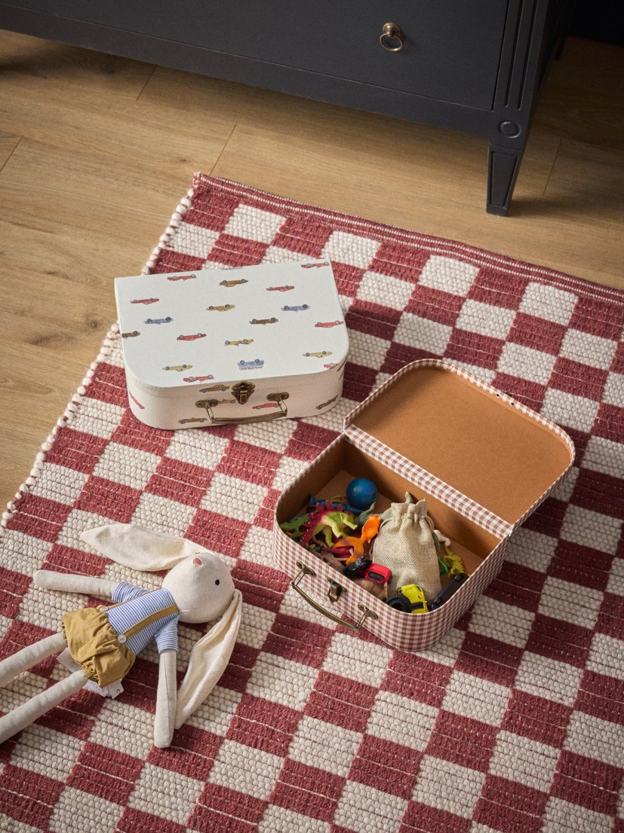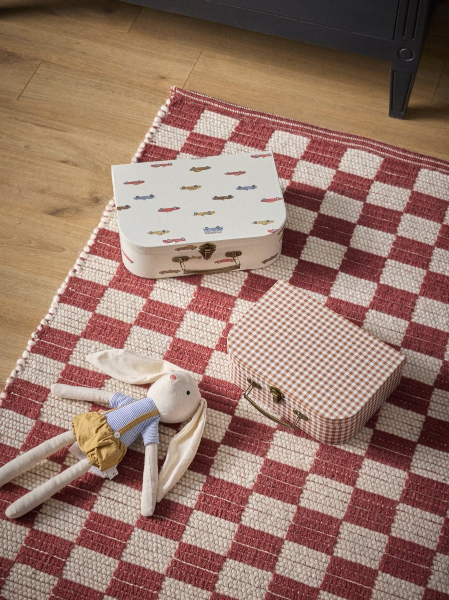 Lot de 2 petites valises de rangement ou de décoration confectionnées en papier imprimé collé à la main. La plus petite est recouverte d’un motif vichy coloris café, la plus grande de notre imprimé Anatole (petits bolides). Dim. L.29 x H.9 x l.20 cm et L.24,5 x H.8 x l.18 cm env.