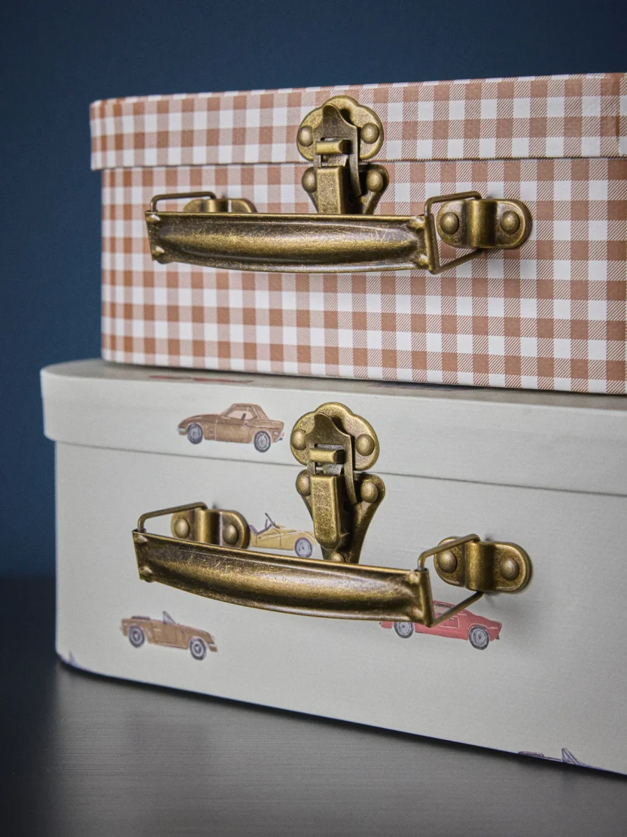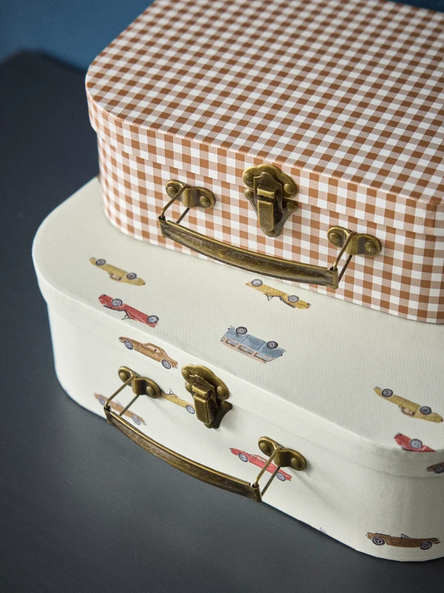 Lot de 2 petites valises de rangement ou de décoration confectionnées en papier imprimé collé à la main. La plus petite est recouverte d’un motif vichy coloris café, la plus grande de notre imprimé Anatole (petits bolides).