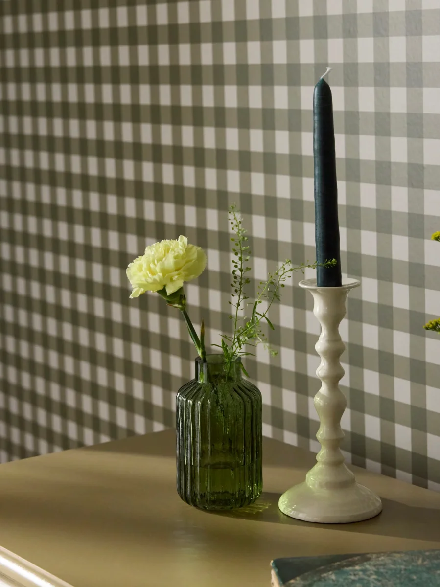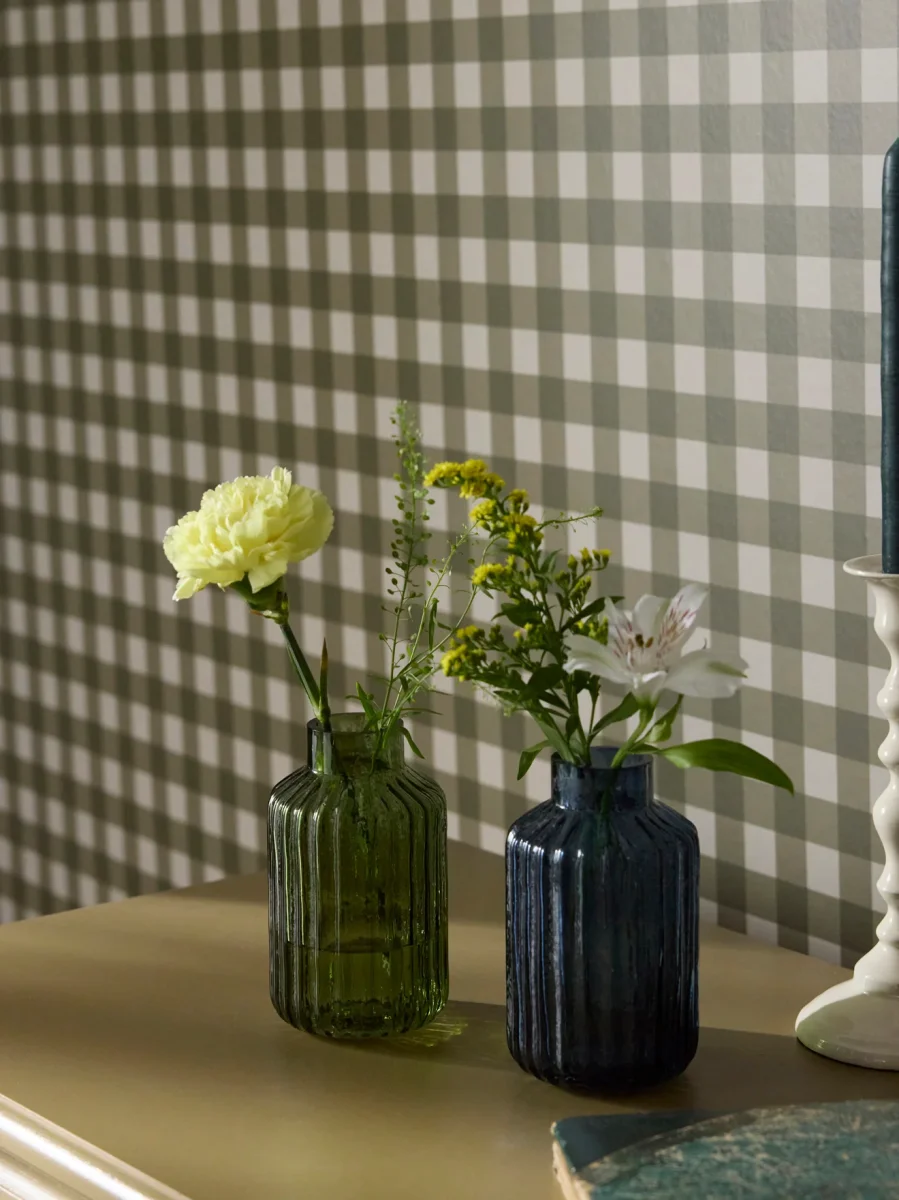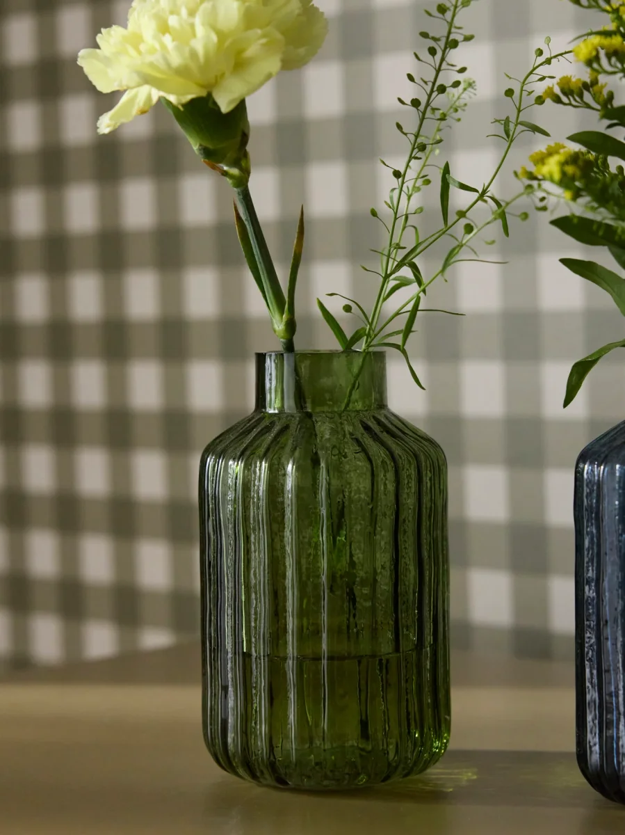 Petit vase ou soliflore en verre strié coloris vert ou bleu. À poser seul ici et là ou à accompagner d’autres vases de la collection.