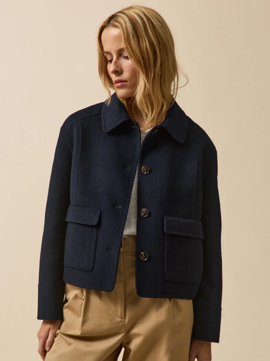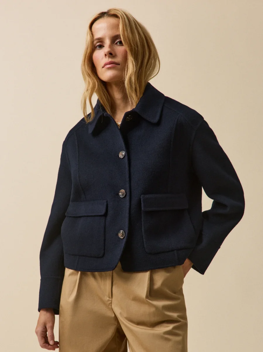 Ligne épurée sur lainage double face chic et chaleureux. Tout en souplesse, la veste se plie aux exigences d’un style urbain contemporain. À l’aise à l’intérieur comme à l’extérieur, elle signe un look ultra confort, toujours impeccable.