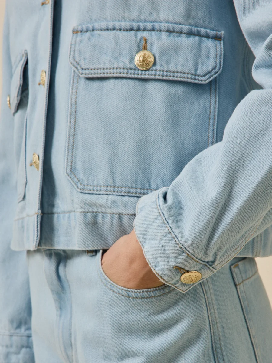 - Coupe droite, surpiqûres contrastées, fermeture par boutons métal, poignets boutonnés