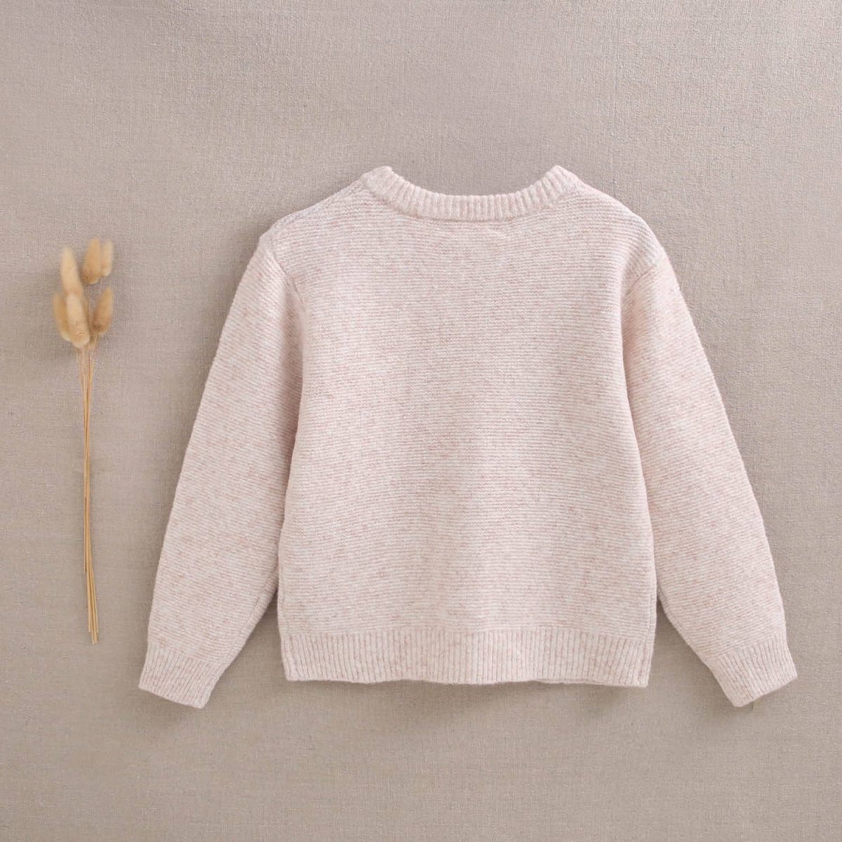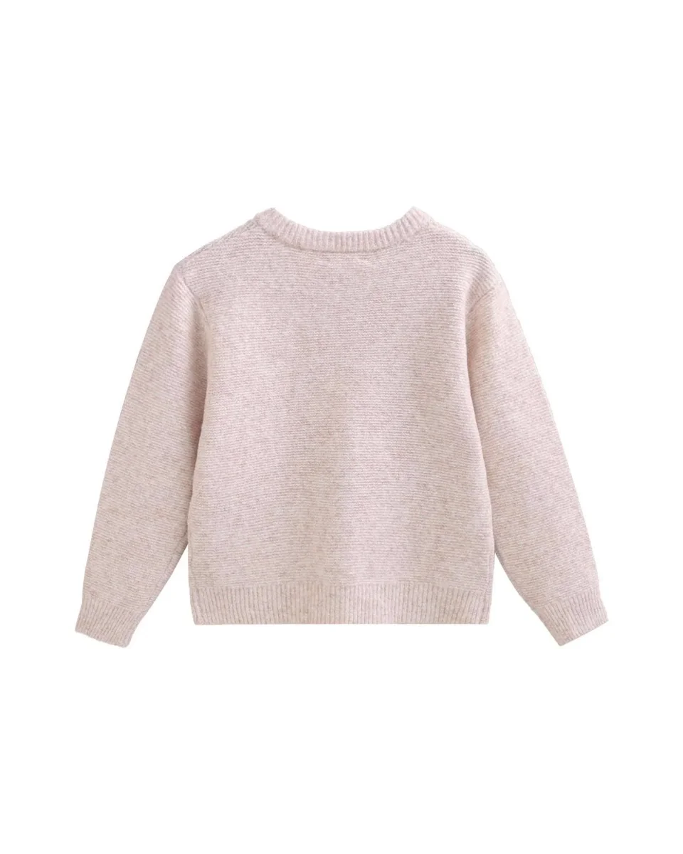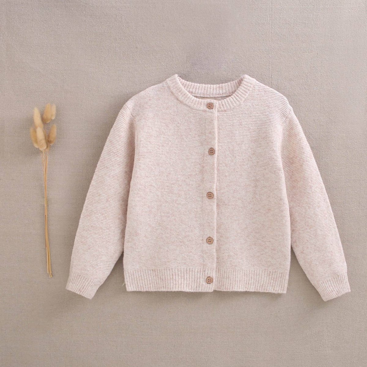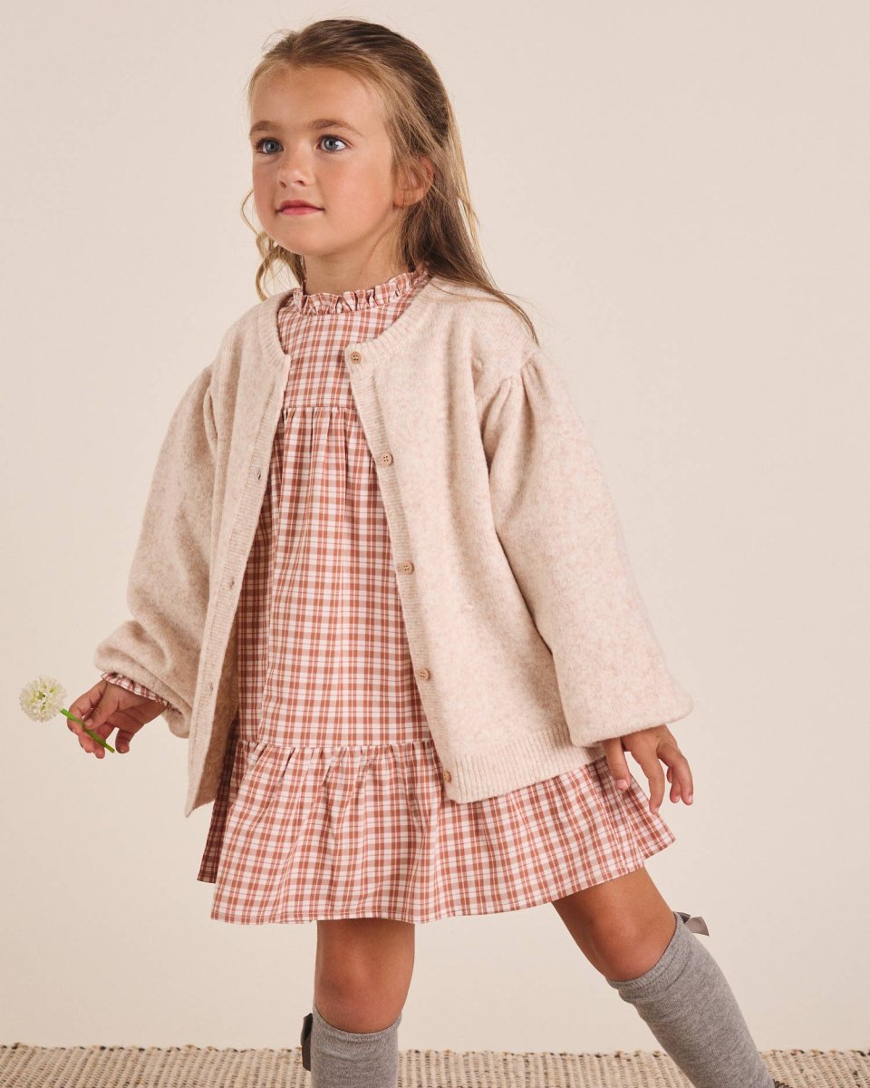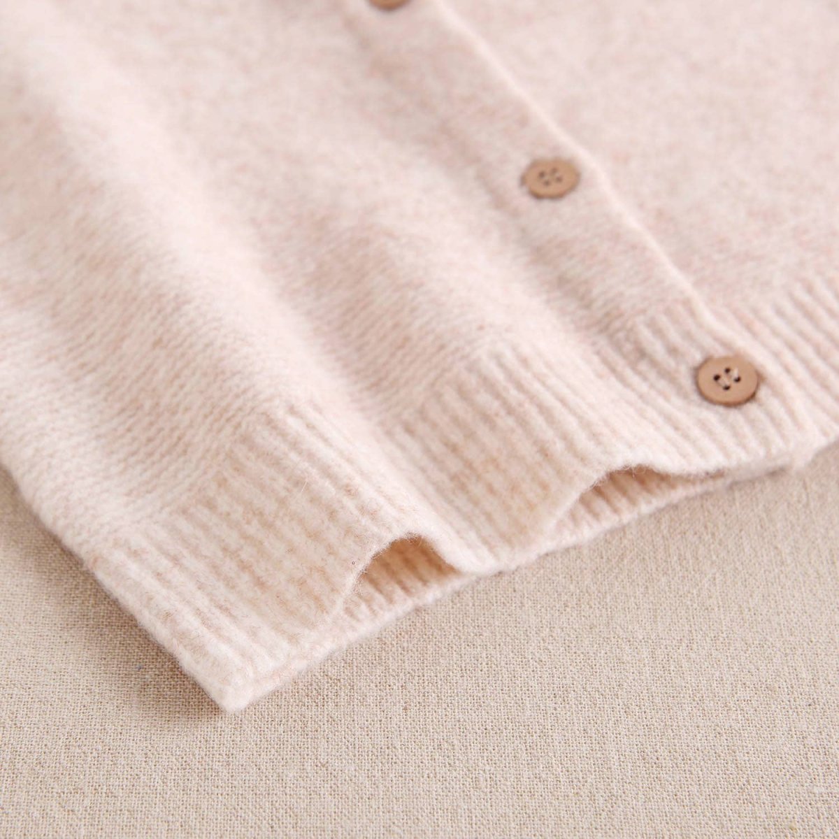 Veste beige pour fille avec boutons en bois. Tissu tricoté.