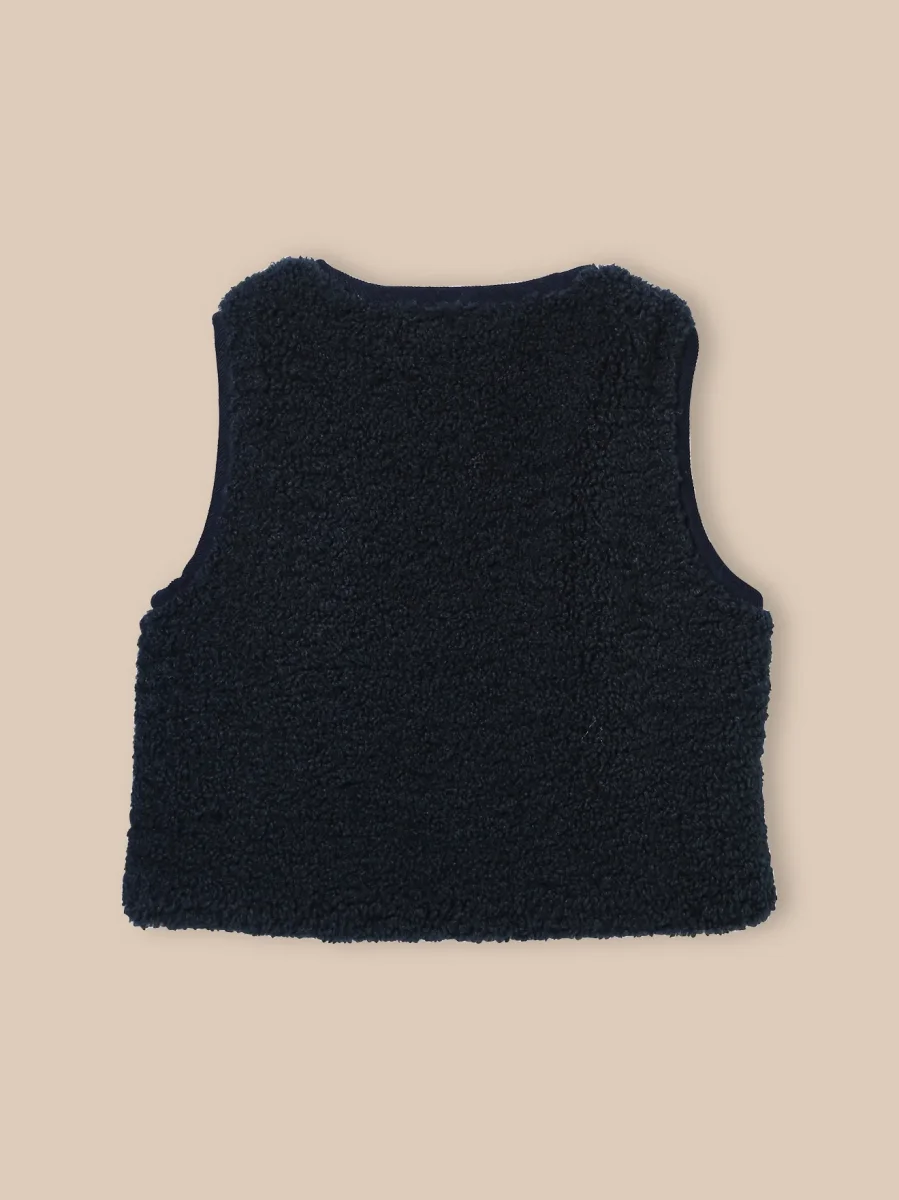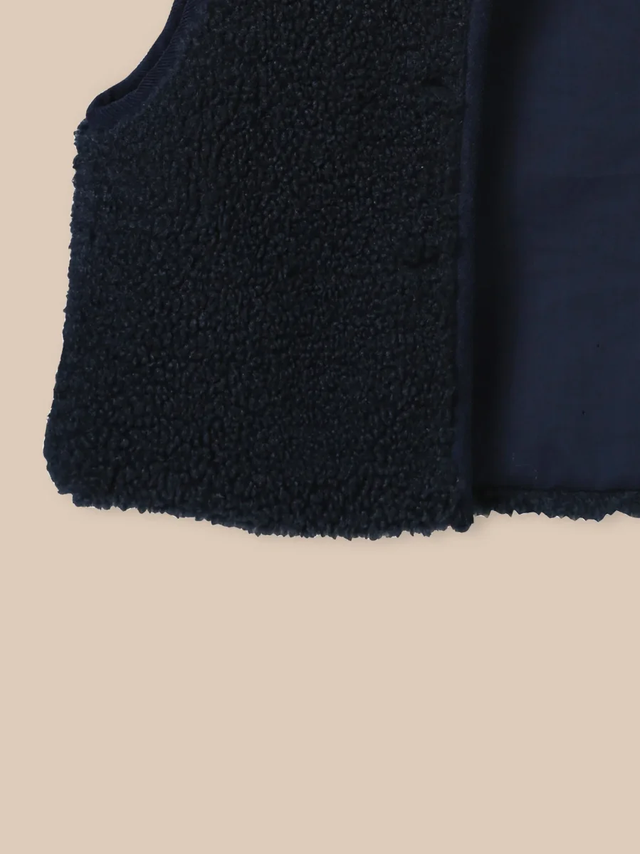 Cette veste en sherpa est parfaite pour réchauffer une guimpe et donner un petit look cosy à la silhouette. Biais en velours contrastés Doublure en voile Fermeture par boutons