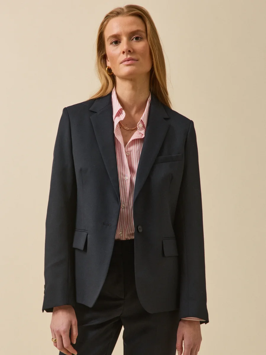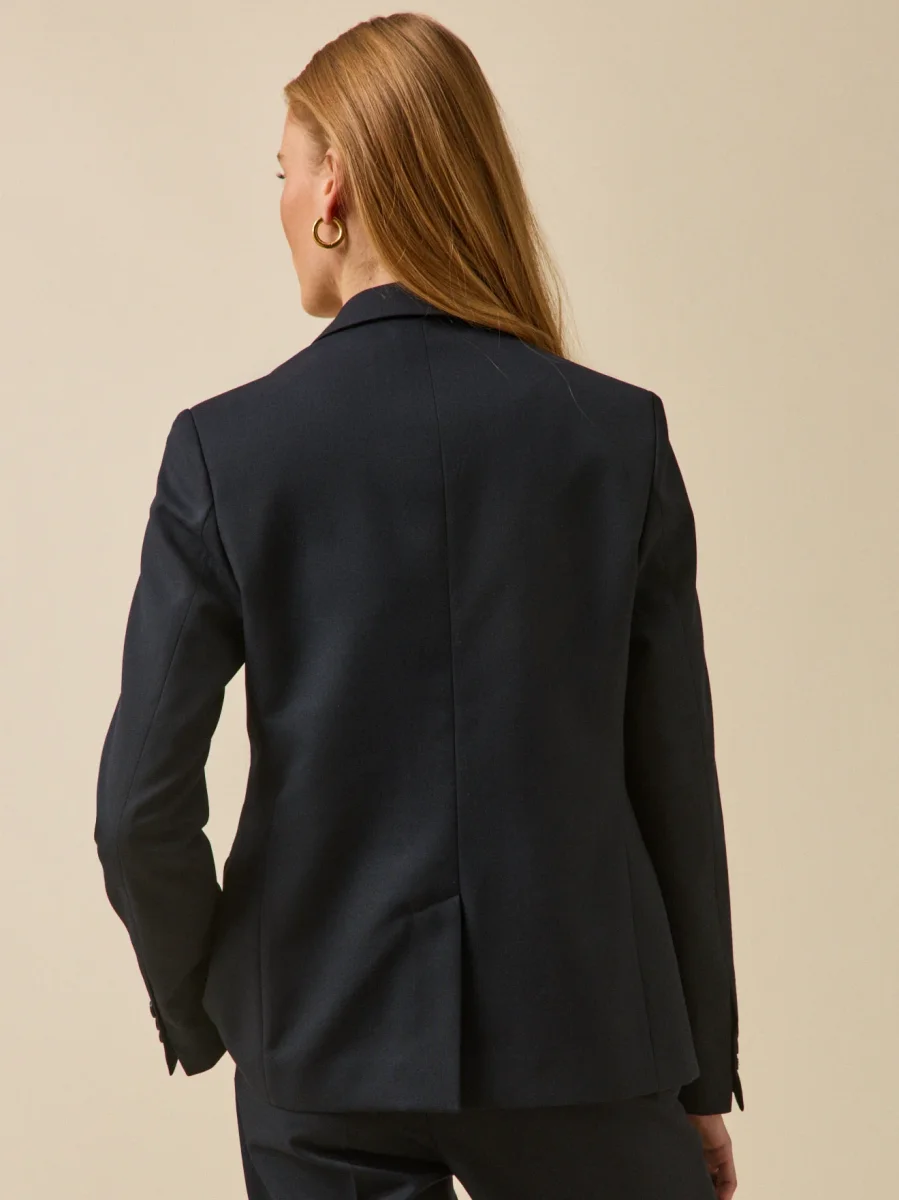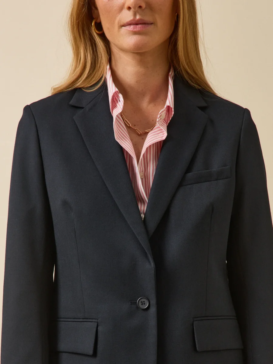 - Coupe ajustée, col tailleur, 1 bouton ; 1 poche poitrine, 2 poches passepoilées à rabat devant ; découpes cintrantes devant