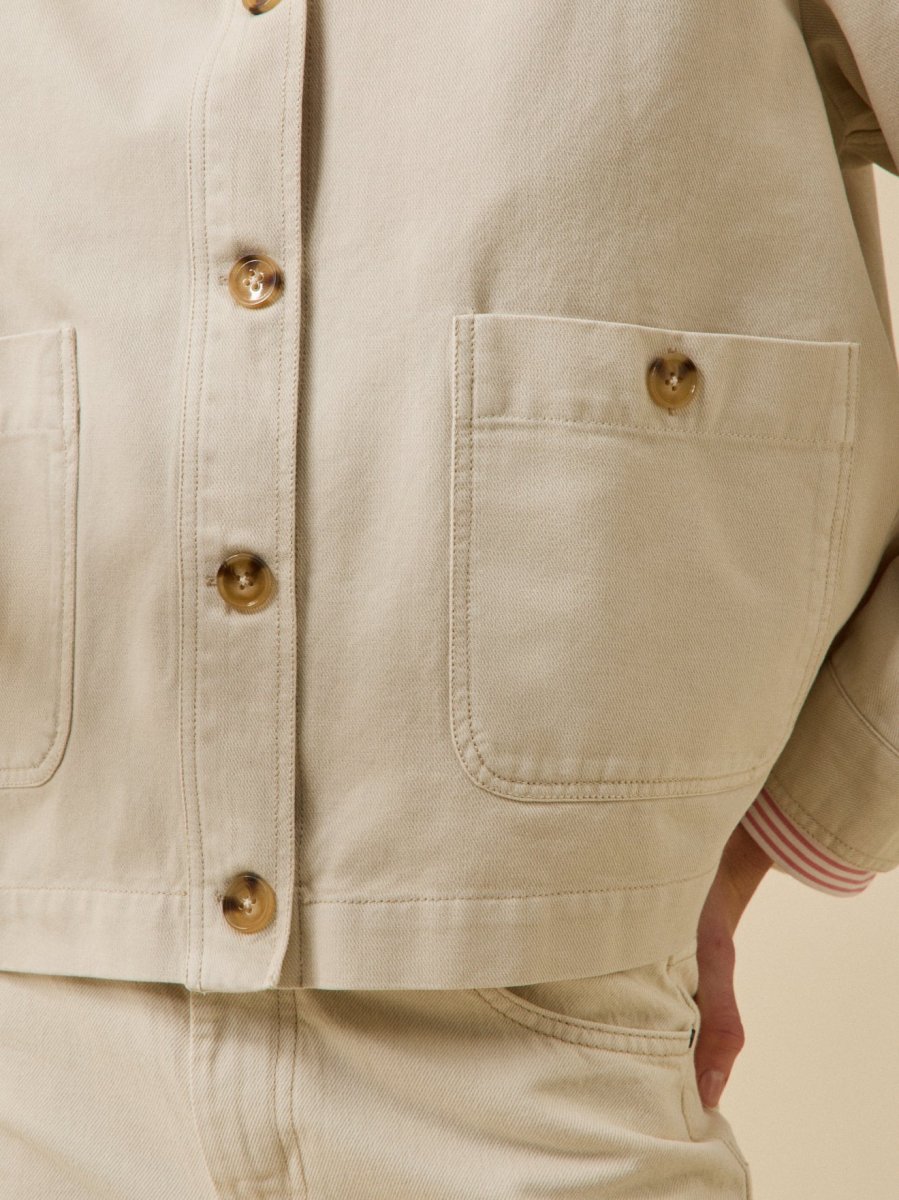 Confectionnée au Maroc dans un twill épais en coton biologique certifié, elle assure une allure cool et authentique. En ville comme au bureau, c’est la nouvelle veste du quotidien.