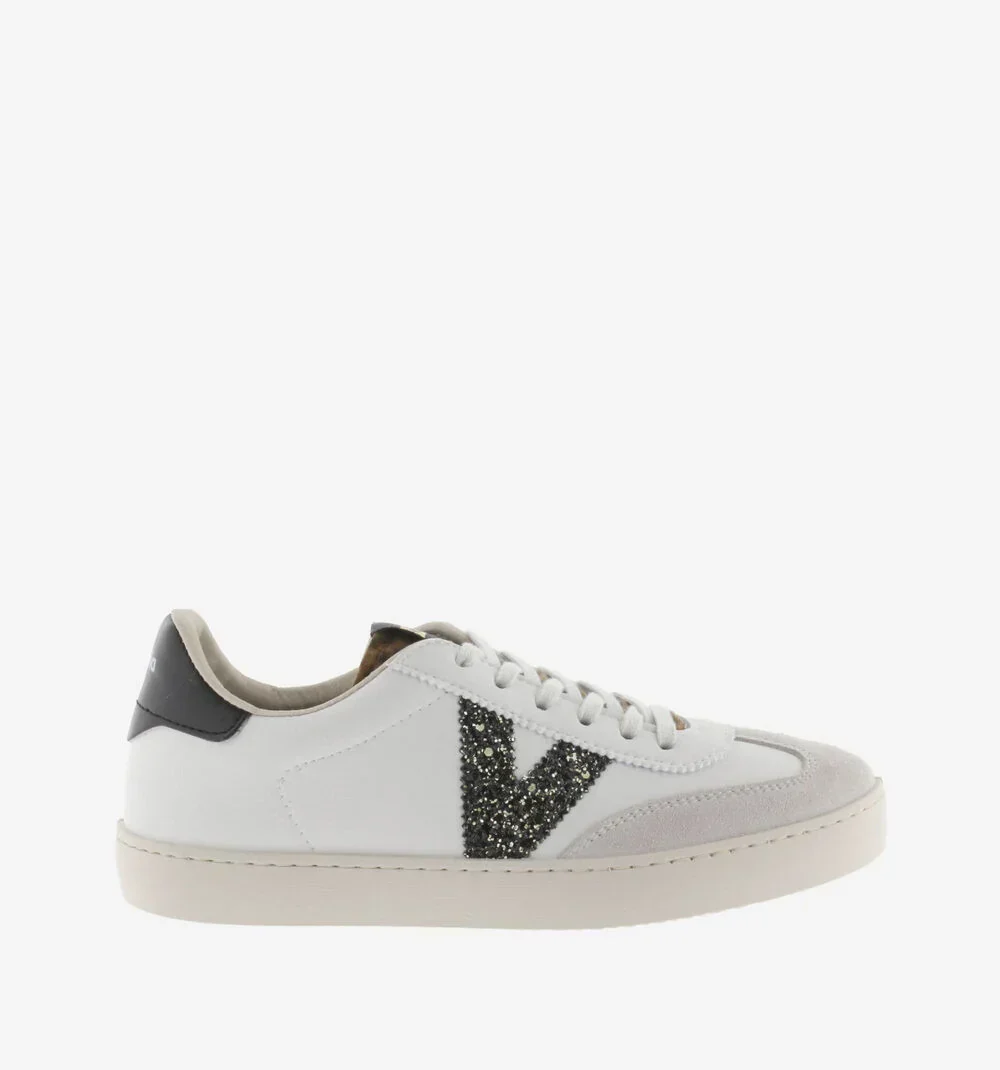 Sneakers Victoria, fabriquées en Espagne avec un matériau effet cuir craquelé et du glitter avec texture sur le V latéral.