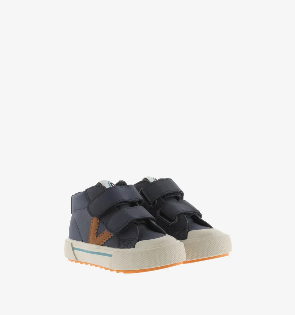 Bottines bleu marine pour enfants. Fabriquées dans une matière effet cuir avec logo de victoria contrastant sur le côté. Semelle bicolore avec détails en fluo et ligne de couleur assortie à l’arrière et la languette. Fermeture à scratch pour favoriser le chaussage et renfort en caoutchouc sur la pointe qui les rend plus résistantes. Leur semelle haute densité offre la garantie d’un plus grand confort.